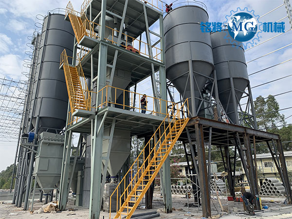 年產(chǎn)10萬噸全自動干混砂漿設(shè)備摒棄傳統(tǒng)地面配料形式,采用塔式布局頂部配料模式,大幅減少物料配比輸送時間、提高生產(chǎn)效率、降低生產(chǎn)成本;旌舷到y(tǒng)根據(jù)產(chǎn)量要求可選用4m3采用大容量無重力雙軸高效混合機(jī),混合時間短,混合精度高,全套設(shè)備由PLC自動控制系統(tǒng)實時控制,自動化管理程度高,工況環(huán)境友好。是實現(xiàn)高效生產(chǎn)、綠色生產(chǎn)、健康生產(chǎn)、智能生產(chǎn)的理想選擇。