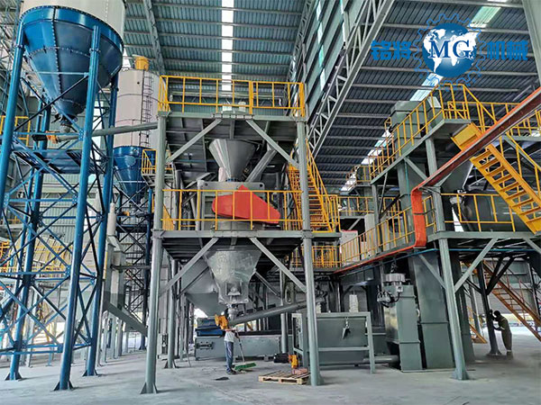 該生產線由儲料系統(tǒng)、輸送系統(tǒng)、稱重配料系統(tǒng)、混合系統(tǒng)、成品儲存系統(tǒng)、包裝系統(tǒng)、除塵系統(tǒng)和電控操作系統(tǒng)等組合而成。在秉承傳統(tǒng)干粉混合生產線運行穩(wěn)定、計量精確、操控簡易的基礎上,采用頂部配料的方式,減少物料輸送行程,降低批次生產所需時間,提高產量。物料在整個生產流程中都在密封環(huán)境下進行,降低灰塵。再配備我公司生產的高性能脈沖除塵器,大大改良生產環(huán)境,保證工作人員的身心健康。