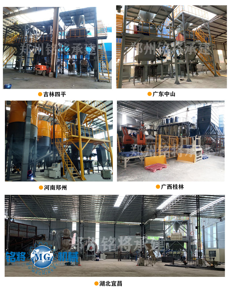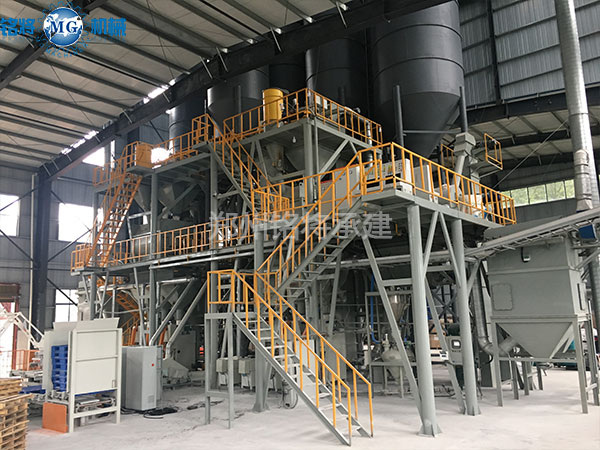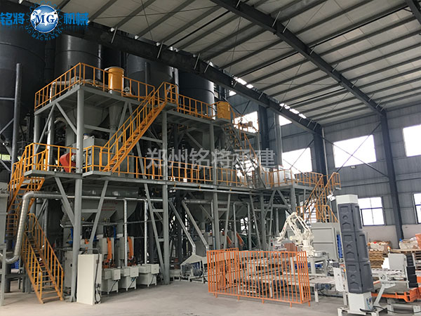 該生產(chǎn)線可在傳統(tǒng)常規(guī)配置的基礎(chǔ)上增加添加劑自動配料系統(tǒng),玻珠及添加劑氣力輸送系統(tǒng),以及成品砂漿自動包裝輸送碼垛系統(tǒng)。