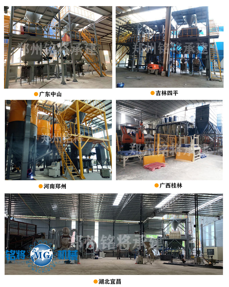 該生產(chǎn)線(xiàn)主要由原料儲(chǔ)存系統(tǒng)、配料稱(chēng)重系統(tǒng)、輸送系統(tǒng)、混合系統(tǒng)、氣相平衡系統(tǒng)、包裝系統(tǒng)及除塵系統(tǒng)構(gòu)成。主控制系統(tǒng)依據(jù)選定工藝配方下達(dá)生產(chǎn)指令,系統(tǒng)自動(dòng)從儲(chǔ)料倉(cāng)中按配比提取原料,原料經(jīng)配重后依次進(jìn)入待混倉(cāng)及無(wú)重力高效混合機(jī),實(shí)現(xiàn)快速混合作業(yè)(3-5分鐘)。達(dá)到混合精度要求后,成品砂漿被輸送至具備二次混合功能的成品倉(cāng),進(jìn)入自動(dòng)包裝系統(tǒng),大大提高產(chǎn)出效率。